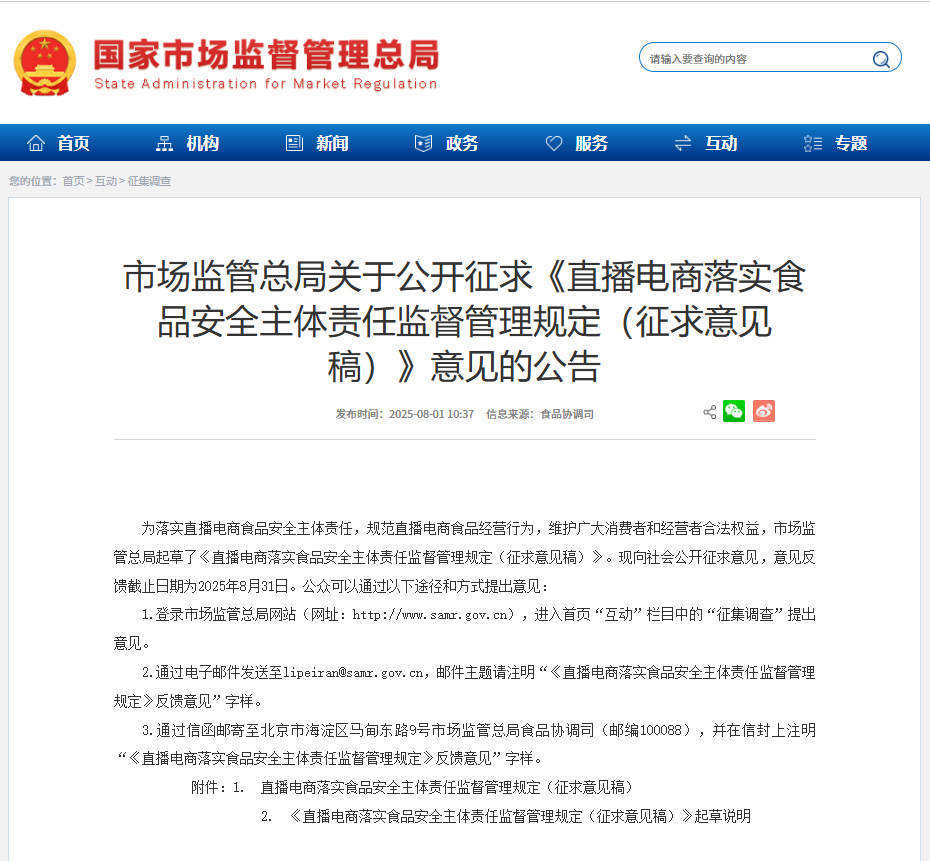 為落實直播電商食品安全主體責任,規范直播電商食品經營行為,行為新規維護廣大消費者和經營者合法權益,規范市場監管總局近日起草了《直播電商落實食品安全主體責任監督管理規定(征求意見稿)》,直播總局征求面向社會公開征求意見。電商