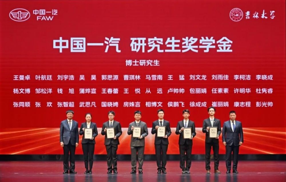 ▲中國一汽總經(jīng)理、黨委副書記劉亦功,吉林大學(xué)校長、中國科學(xué)院院士張希為中國一汽研究生獎(jiǎng)學(xué)金(博士研究生)獲獎(jiǎng)代表頒獎(jiǎng)